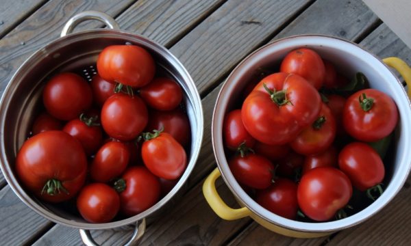 I easily filled two big pans’ worth of tomatoes after just 10-15 minutes of picking from my two bushes. This year, I grew one Roma and one beefsteak variety. Now, what to do with them?