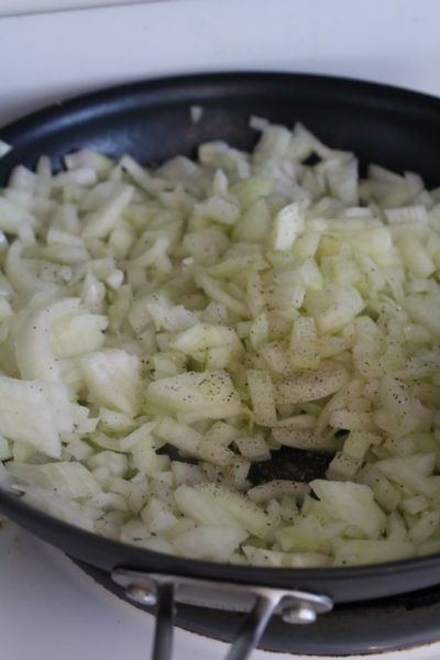 With your tomatoes set aside, saute your onions in a heavy skillet in the olive oil. I like to get mine nice and golden in color, without browning or burning them. This took me about 5-6 minutes.