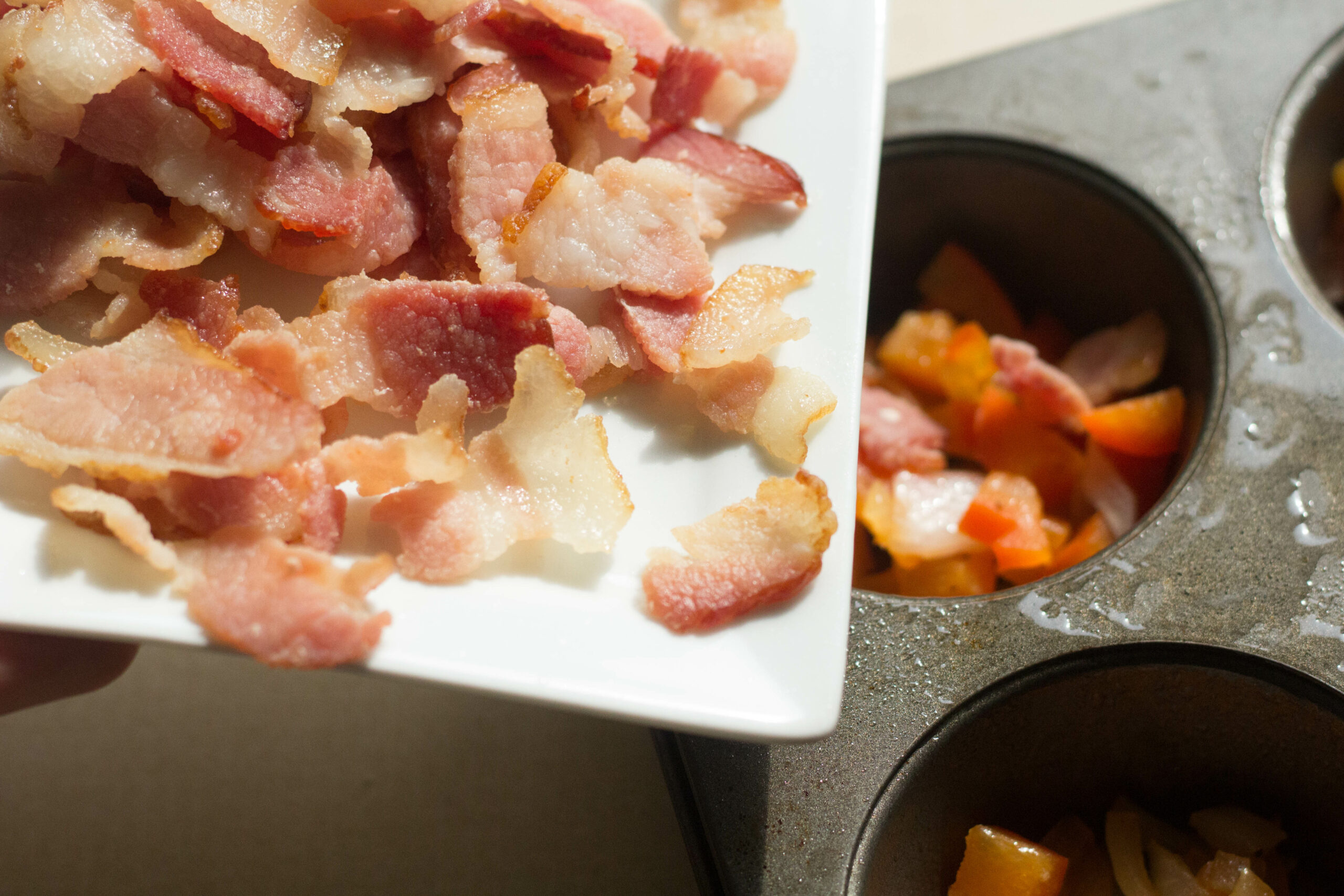 Next, divide the bacon up evenly on top of the veggies.