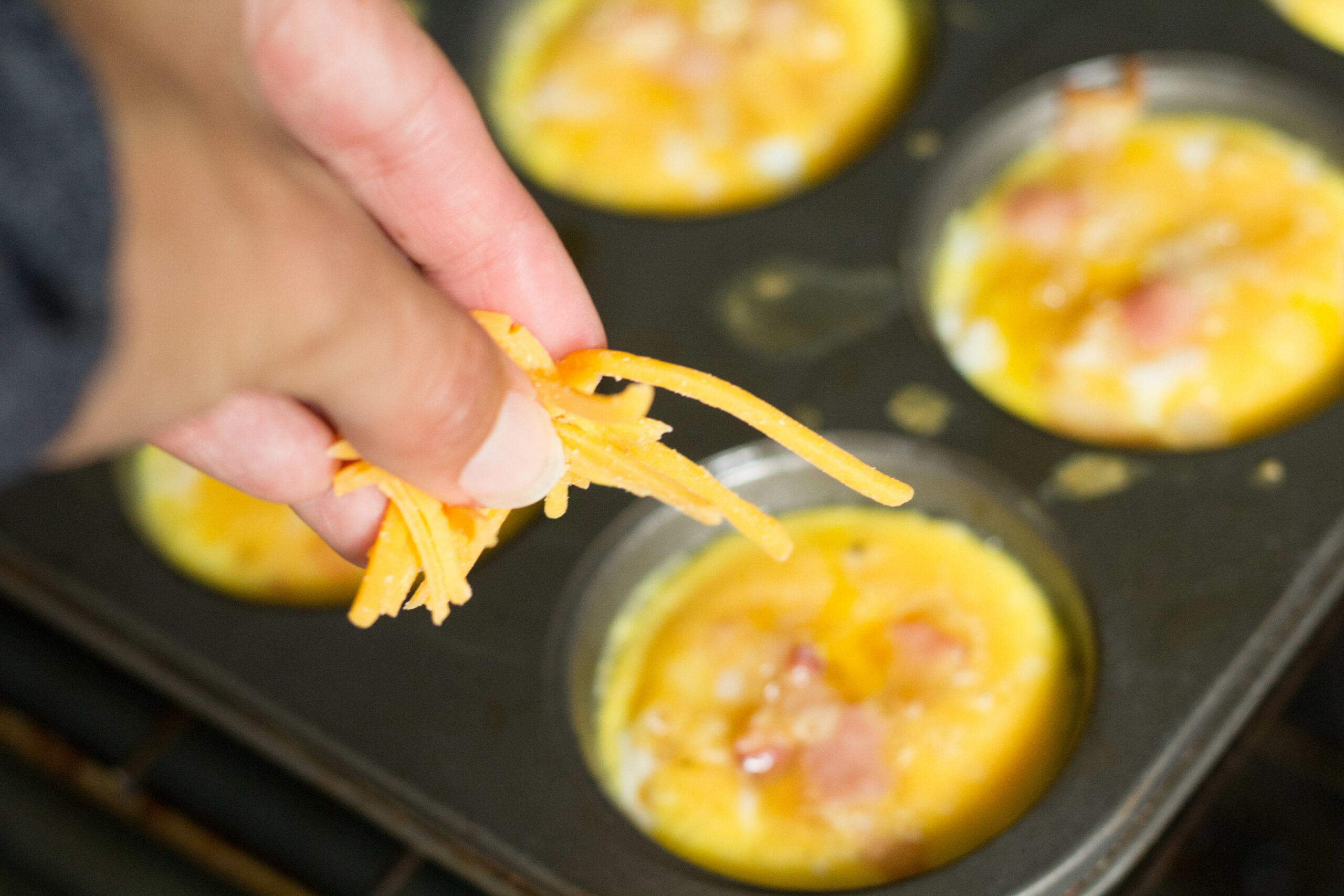 Again, you could have just stirred it into the egg mixture, but I like to really taste a definite cheese layer – so this was my solution! When topping, try to keep the cheese in the center of each egg bite.