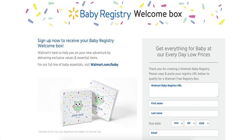When you sign up for the baby registry at Walmart, you qualify for a free Walmart Baby Registry Welcome Box. The items in the box you’ll receive will vary. Still, you’ll get a bunch of samples of different types of baby items, such as: