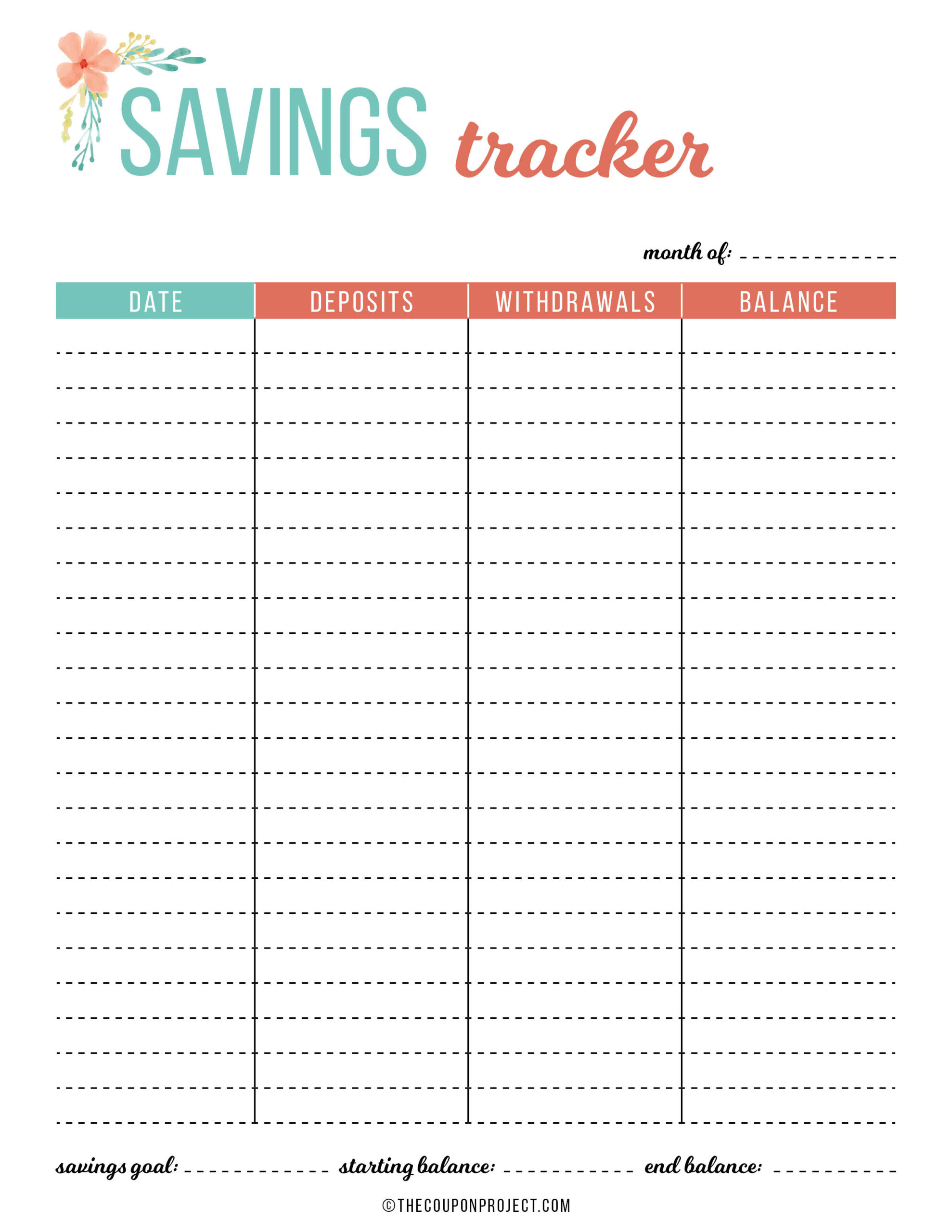 Savings Tracker. This printable will help you track your savings goals. If you have multiple savings accounts or multiple goals, you can print a sheet for each.
