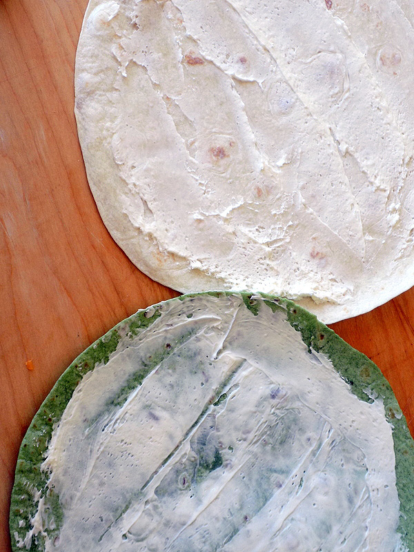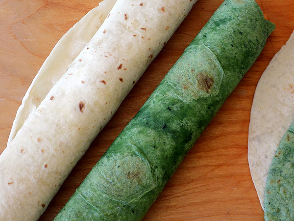 - 4 burrito size tortillas or wraps (I used spinach herb wraps – yum)