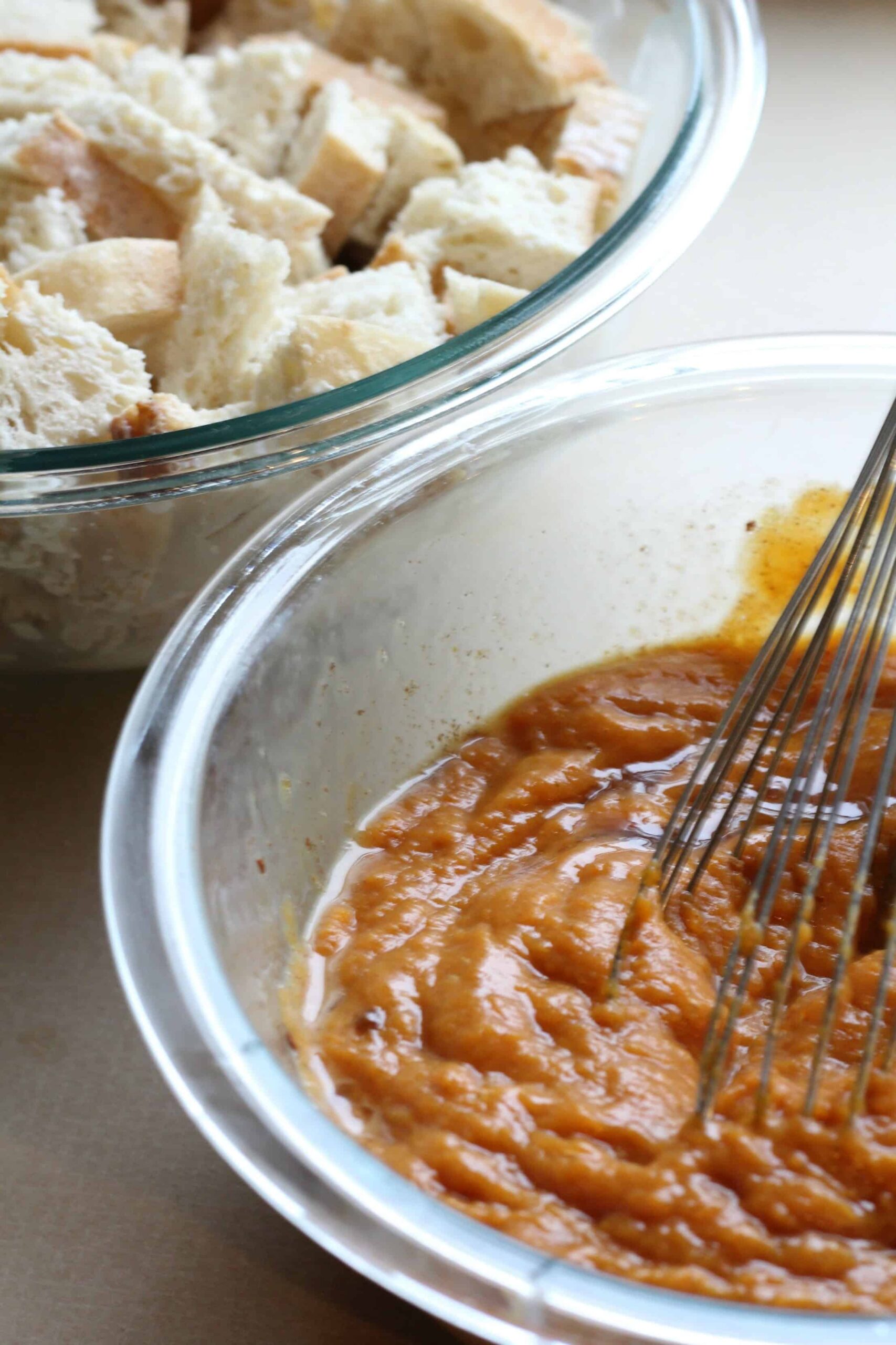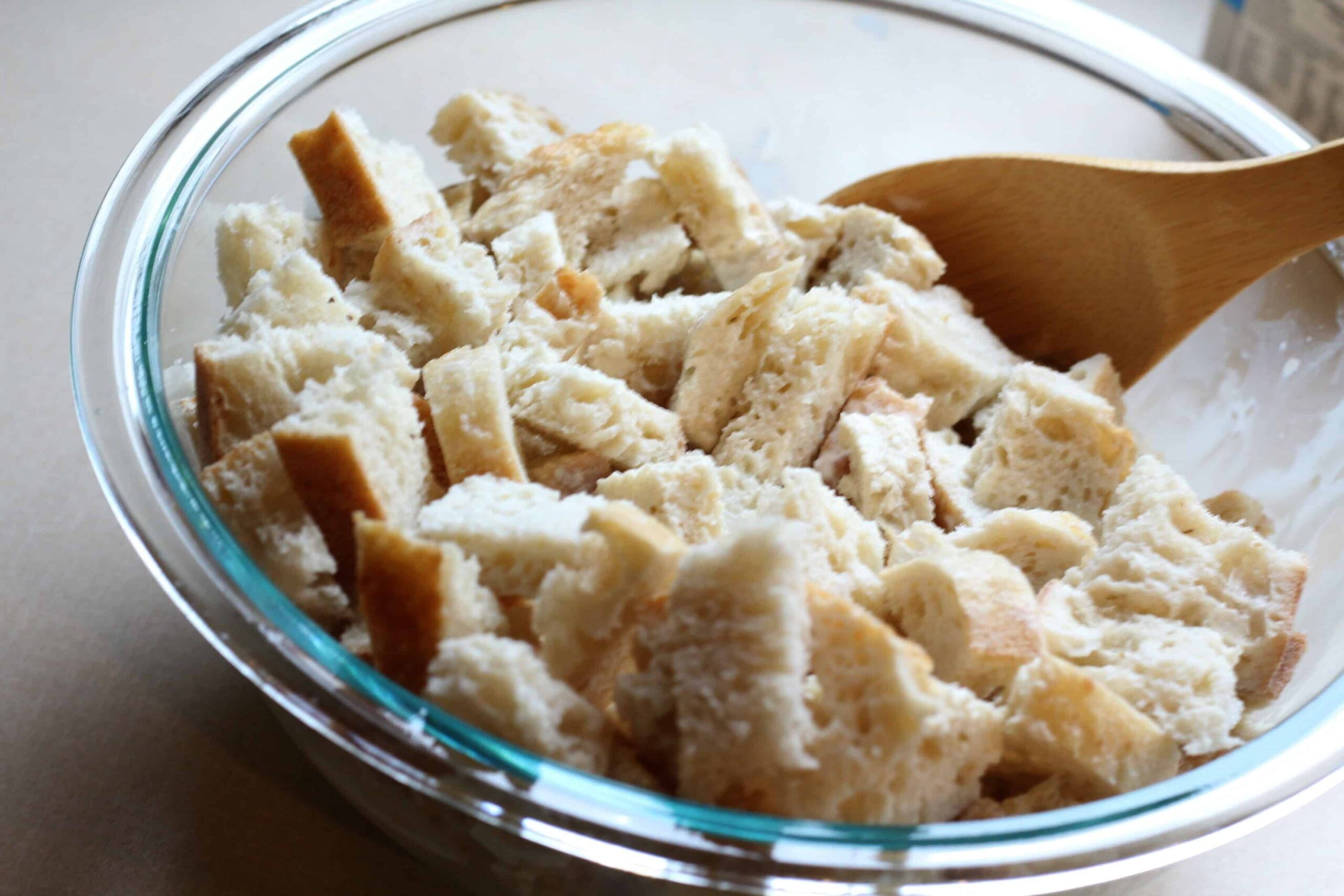 Start by cubing your bread and placing it in a large bowl.
