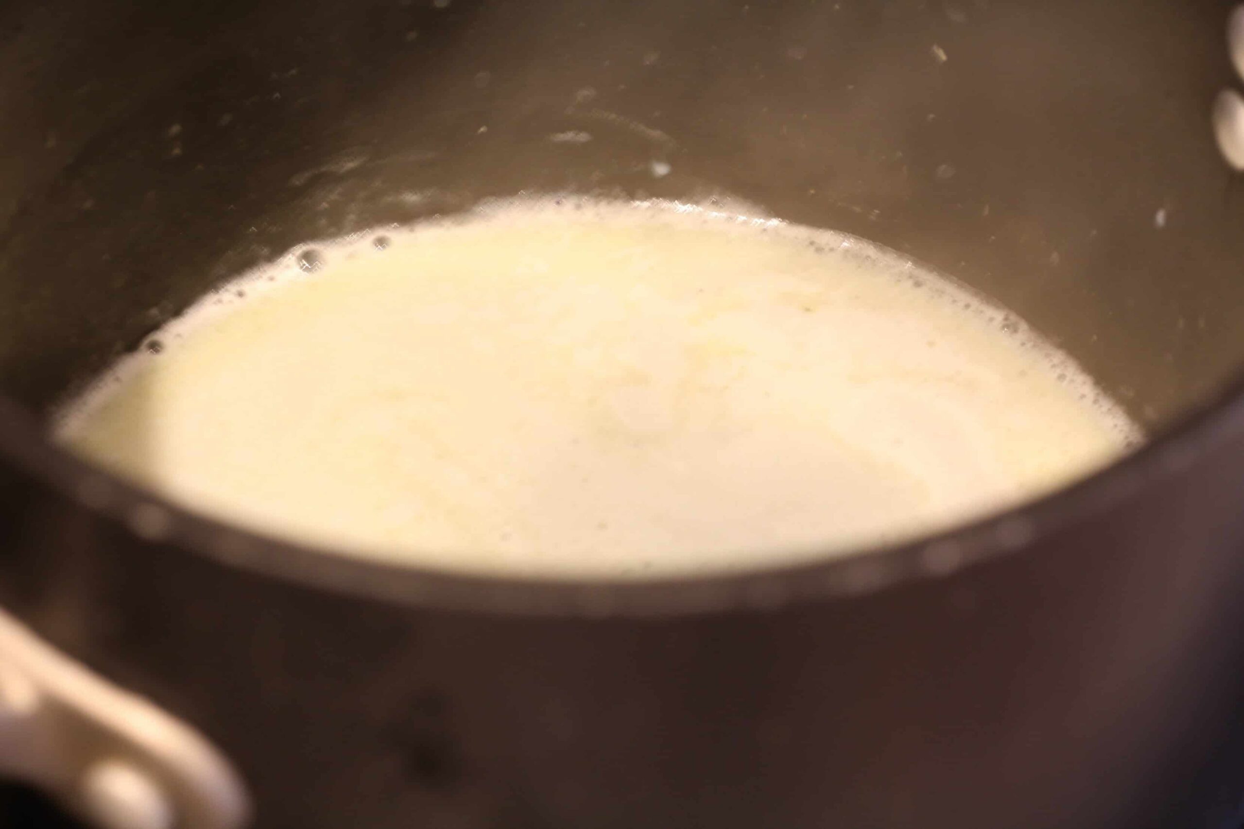 While your bread pudding is baking, you can prep your sauce. It’s quick and easy. Melt the butter, whisk in the flour or cornstarch until bubbly. Add the milk, sugar, and bourbon. Keep stirring until thick – this will happen as it comes to a boil. Then, remove from heat and stir in the vanilla and cinnamon. If you want a thinner sauce, add more milk. To make it thicker, more flour. It’s a pretty forgiving sauce and you can tweak it as you go.