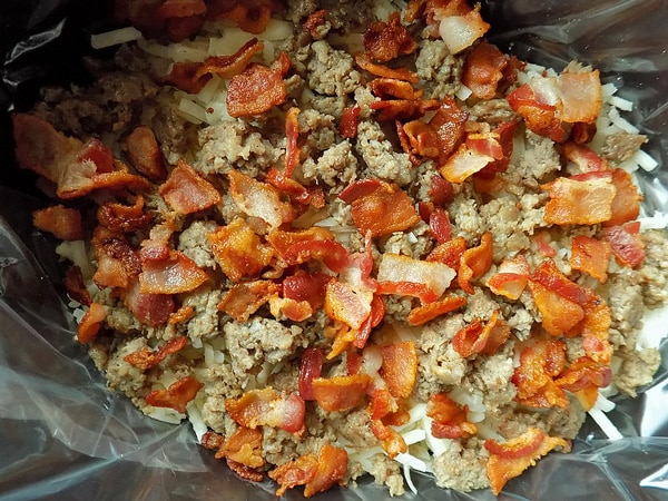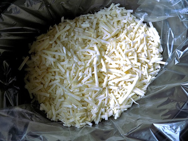 First, layer half of the hash browns into the bottom of your slow cooker.