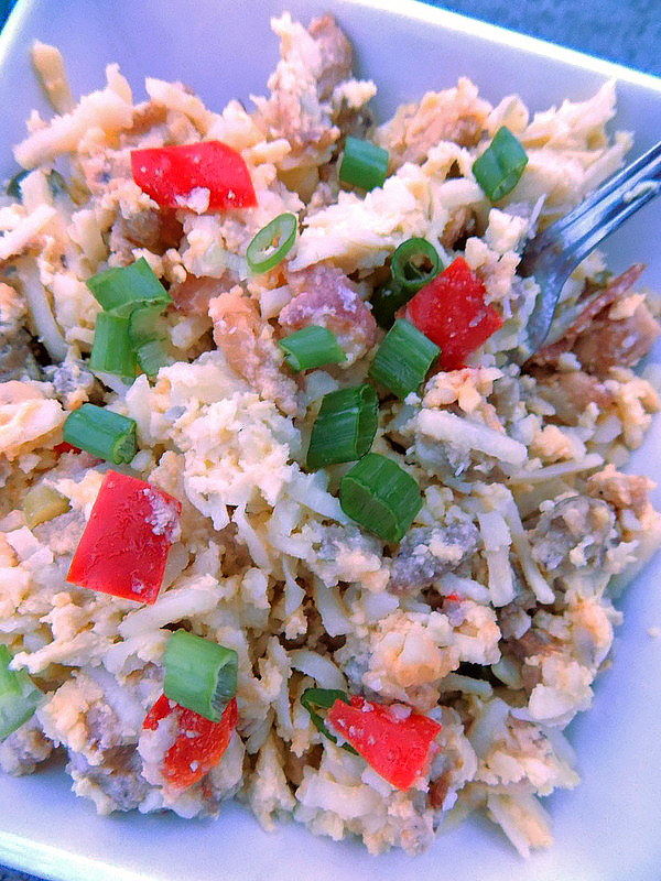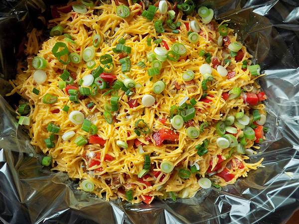 Now repeat the above steps.  Hash browns, bacon & sausage, bell pepper and cheese.  Finish with sliced green onion.  Doesn’t that look Christmas-y??